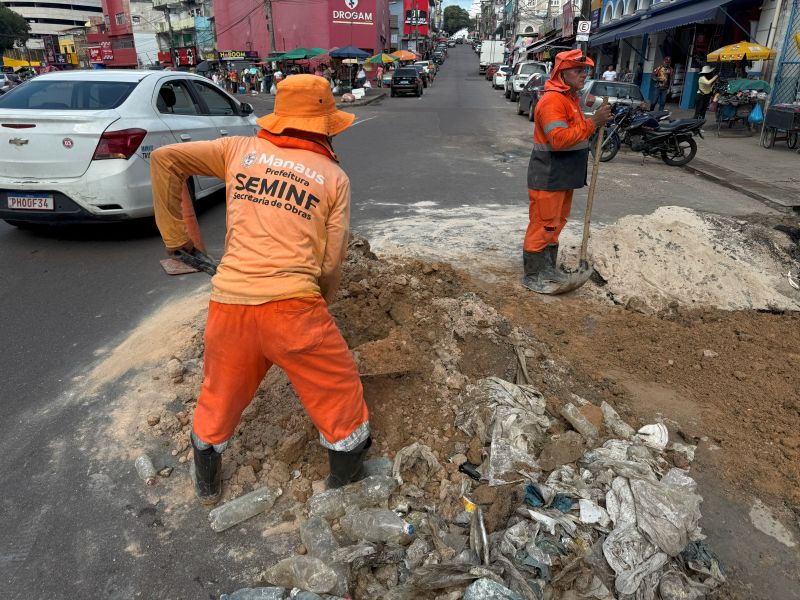 Prefeitura de Manaus realiza desobstrução de rede de drenagem profunda e combate alagamentos na avenida Floriano Peixoto